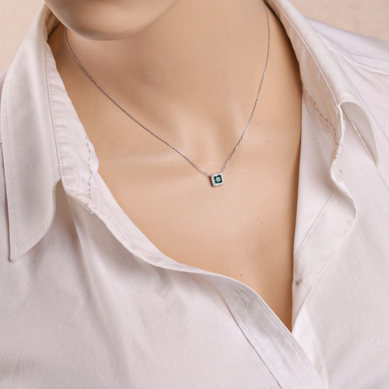 Купить колье Серебро 925. Элегантное колье из серебра 925 с зелёным фианитом привлекает внимание выразительной геометрической формой. Центральный камень квадратной огранки насыщенного зелёного цвета красиво переливается на свету и создаёт эффект яркого драгоценного акцента.
