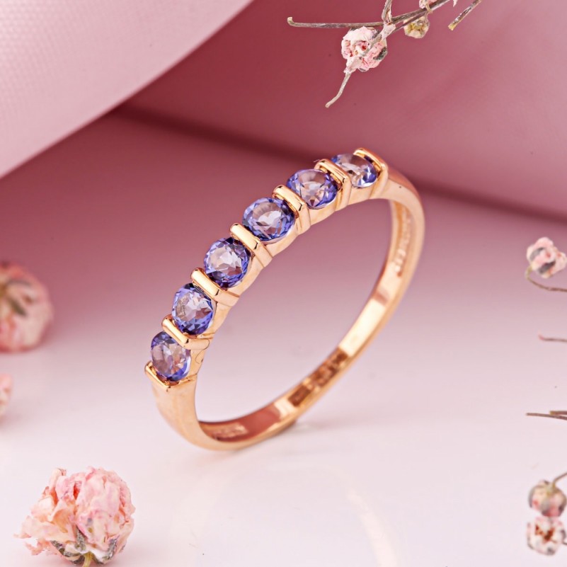 Игра холодных сине-фиолетовых оттенков в сочетании с тёплым блеском красного золота формирует выразительный контраст, благодаря которому кольцо выглядит одновременно утончённо и заметно. Огранка камней обеспечивает активное отражение света, придавая украшению живое мерцание при любом движении руки.