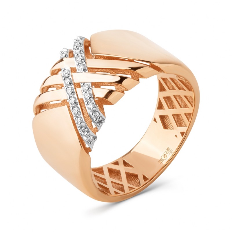 Купить кольцо золото 585 фианит. Кольцо из красного золота с выразительной многослойной композицией — это украшение с ярким характером и современной эстетикой. Переплетение гладких золотых линий создаёт ощущение движения и глубины, формируя сложную, архитектурную форму.