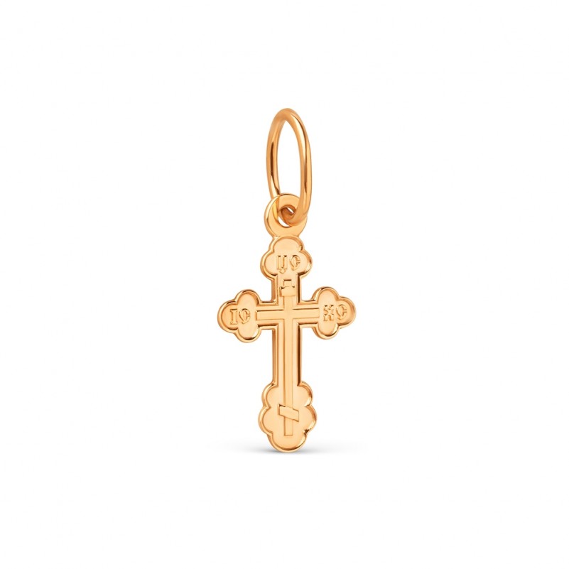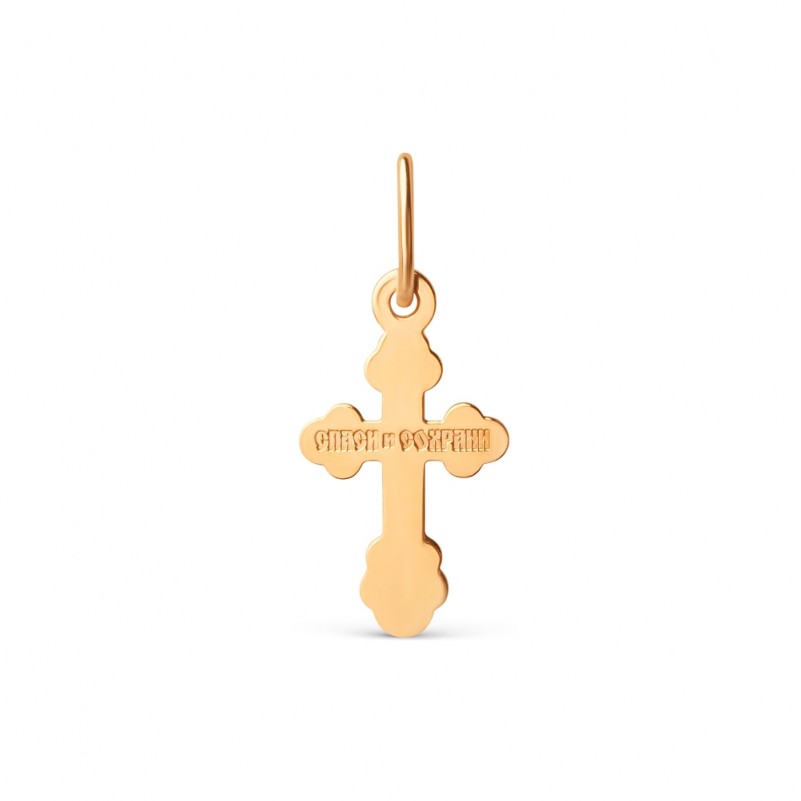 Крест нательный золото 585. Православный крест из красного золота 585 пробы с каноническими пропорциями и гравированными элементами. На лицевой стороне — крест с традиционными обозначениями «IC XC», на обороте — надпись «Спаси и сохрани».