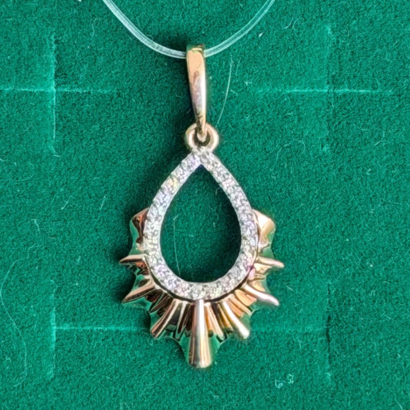 Золотые подвески 585 цена. Подвеска из красного золота притягивает взгляд выразительным силуэтом, в котором сочетаются плавная каплевидная форма и лучевая композиция в нижней части. Украшение словно раскрывается вниз, создавая эффект сияния и движения, как мягкий отблеск света.