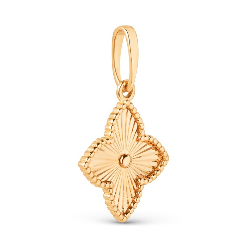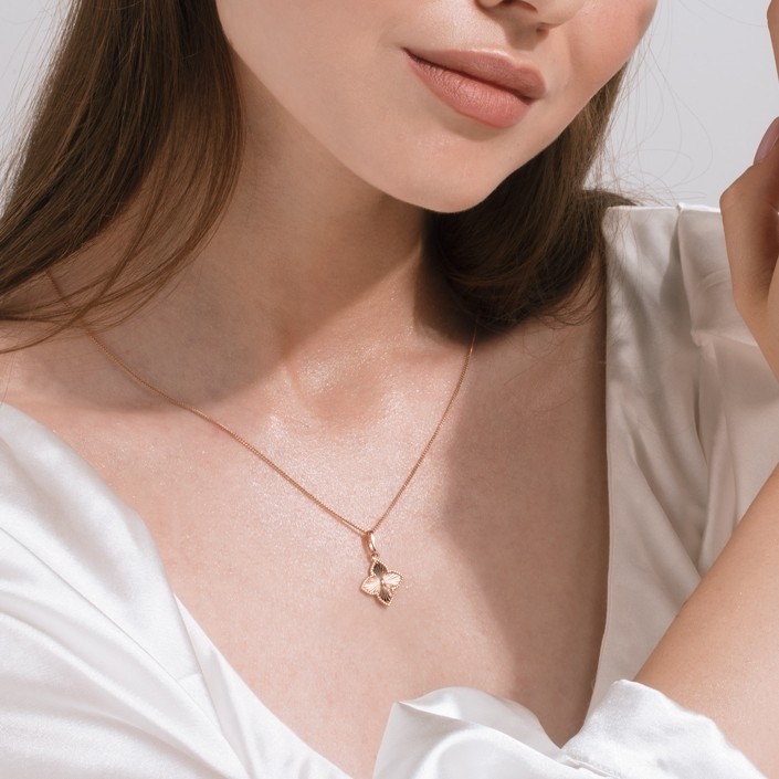 Подвеска из красного золота 585. Подвеска из красного золота притягивает взгляд выразительной геометрией и тонкой игрой света. Четырёхлепестковая форма с мягкими линиями создаёт ощущение гармонии и завершённости, а лучевая фактура в центре словно раскрывается изнутри, наполняя украшение живым сиянием.