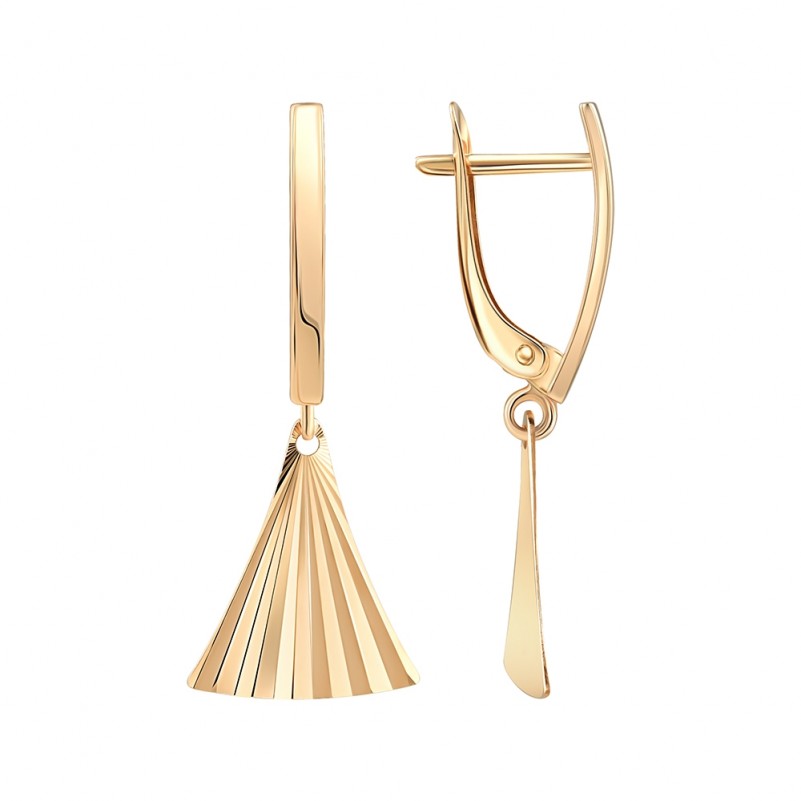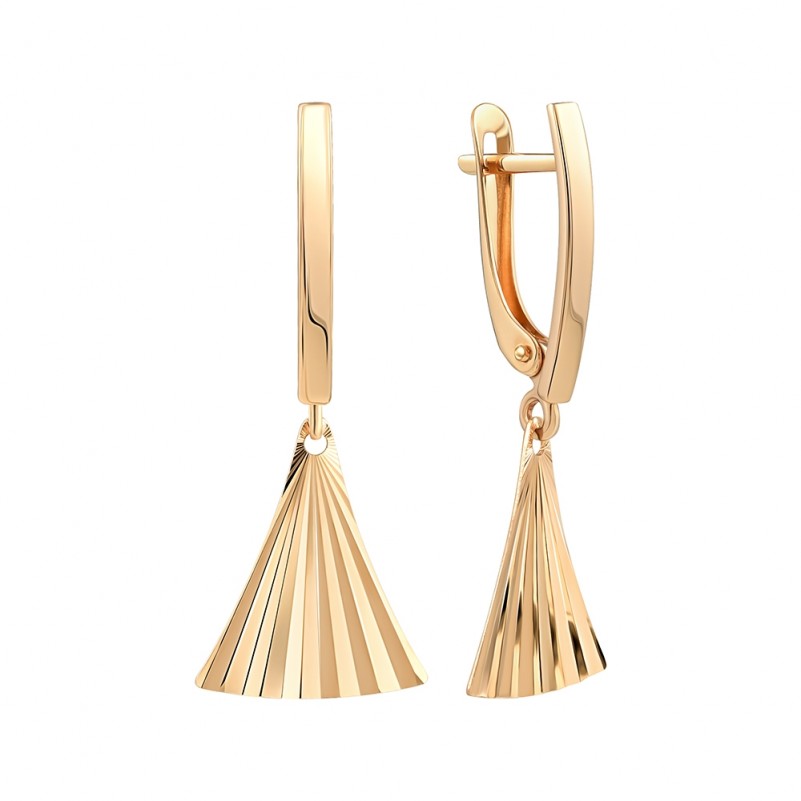 Золотые серьги 585. Эти серьги-подвески из красного золота 585 пробы — как игра света в движении. Веерообразная форма с тонкими лучами создаёт эффект мягкого сияния, словно тёплый свет, расходящийся от центра.