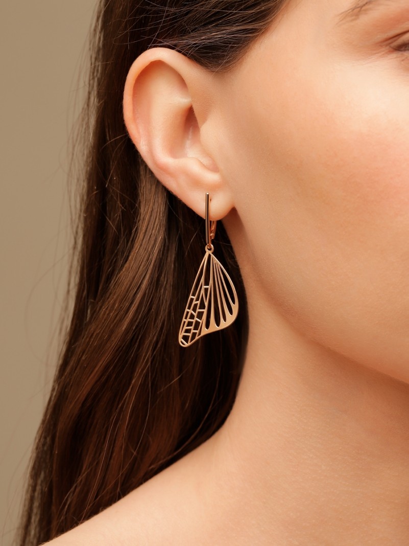 Золотые серьги 585. Эти серьги-подвески из красного золота 585 пробы словно нарисованы светом. Их ажурная форма напоминает тонкие крылья — лёгкие, воздушные и почти невесомые.