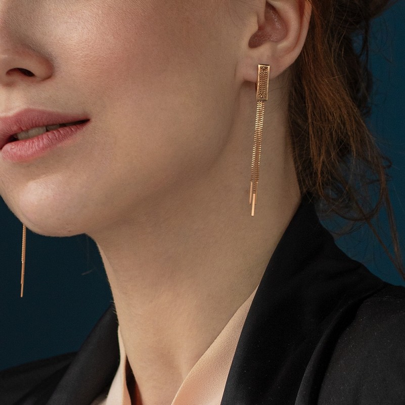 Золотые подвески 585. Эти серьги подвески — чистая линия движения, воплощённая в золоте. Лаконичная геометрическая основа переходит в тонкие панцирные цепочки, которые мягко струятся вниз, создавая эффект живой динамики при каждом шаге.