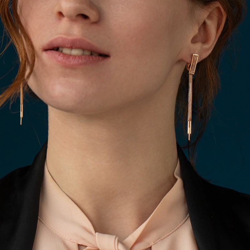 Зеркальная поверхность красного золота отражает свет, а подвижные подвески добавляют ощущение лёгкости и свободы. Дизайн словно балансирует между строгостью формы и текучестью линий — современно, изящно и притягательно.