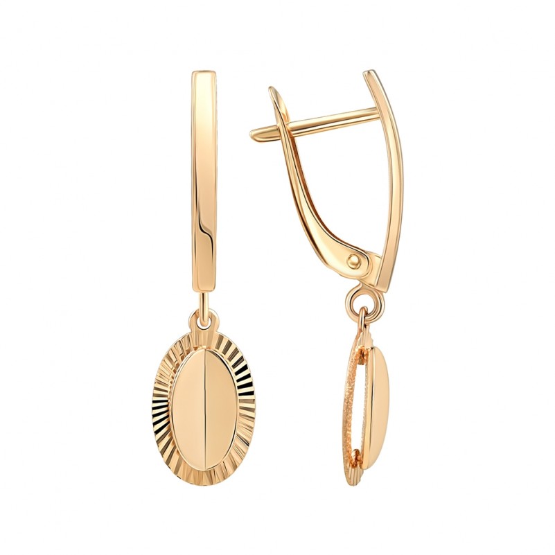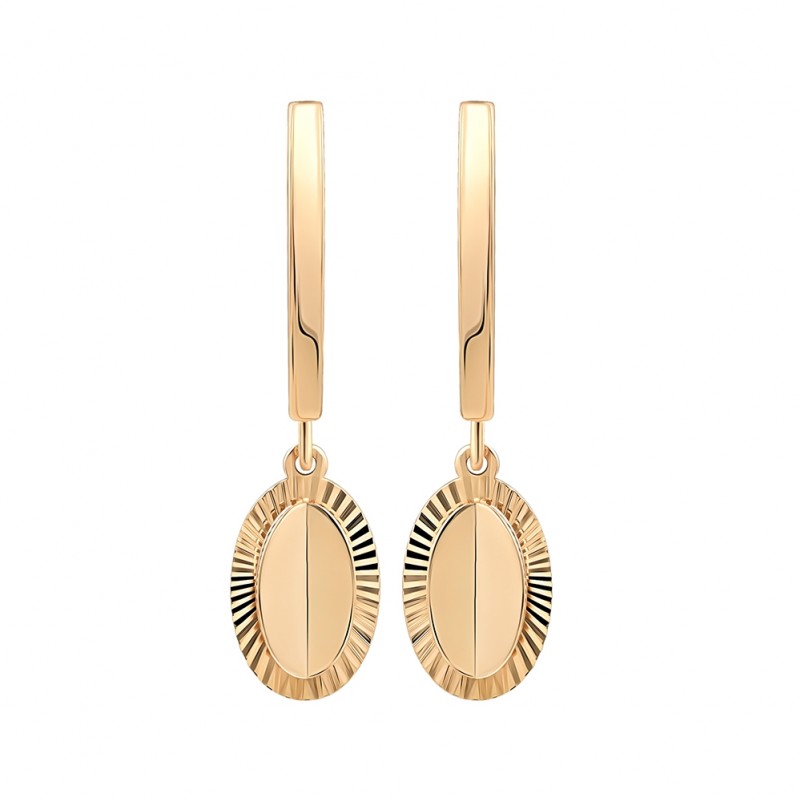 Купить золотые серьги 585. Эти серьги подвески из красного золота — про сдержанную элегантность, где каждая деталь работает на ощущение гармонии. Гладкая, зеркальная поверхность красного золота мягко контрастирует с тонкой лучевой огранкой по краю подвески, создавая деликатную игру света.