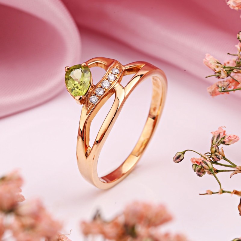 На свету кольцо выглядит особенно живо: хризолит словно светится изнутри, а бриллианты создают чистые, утончённые вспышки, усиливая ощущение свежести, лёгкости и ювелирной гармонии.